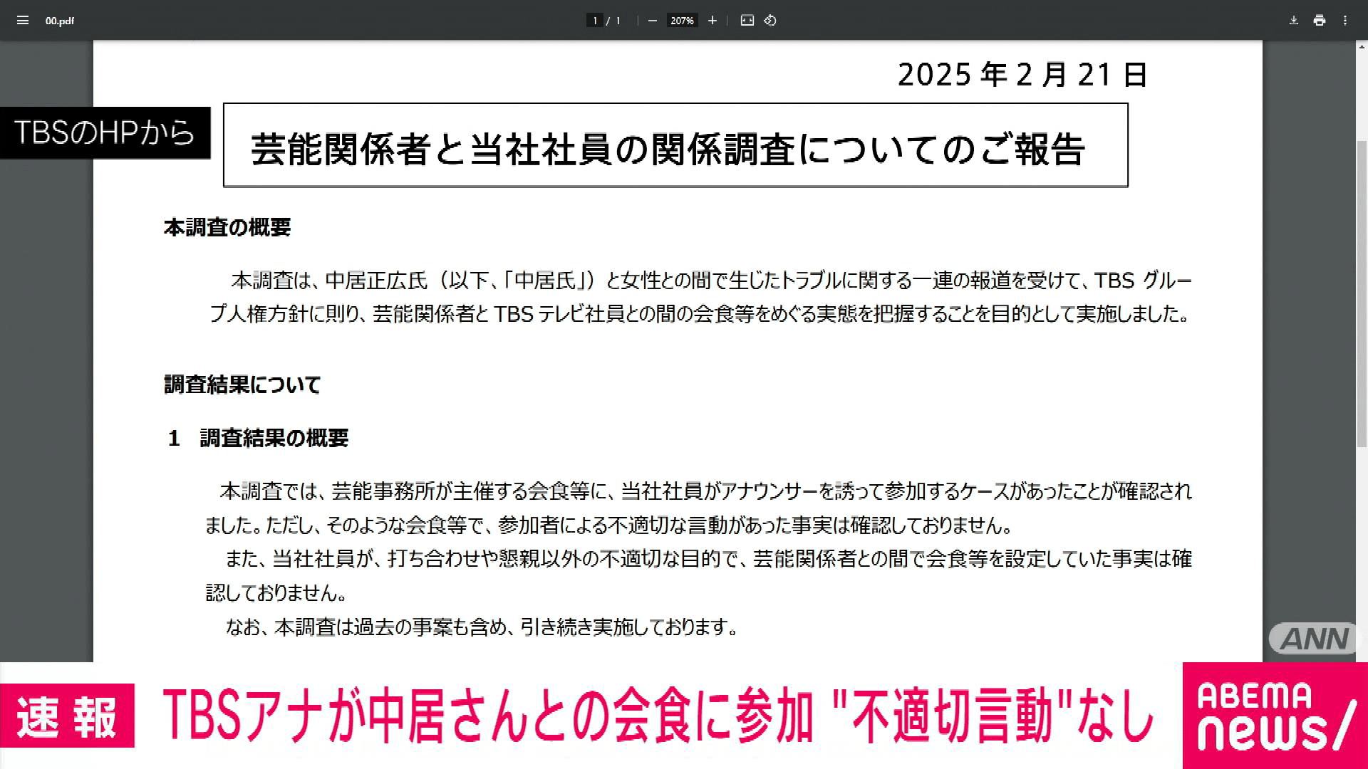 この調査でTBSの女性アナウンサーが中居氏が出席した会食に参加していた事例が確認されており、参加者による不適切な言動は見受けられなかったことが明らかになりました。